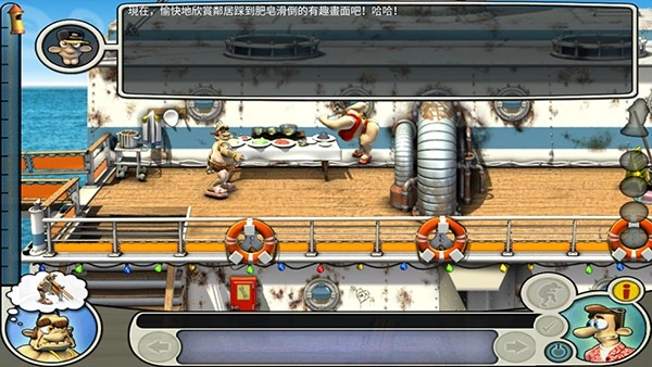 第六步,回到右中,装上信号弹,到躺椅处躲藏。老头被整治离开右中后,在船长室使用安眠药和密码纸,再回到躺椅,恭喜,你成功通关啦。