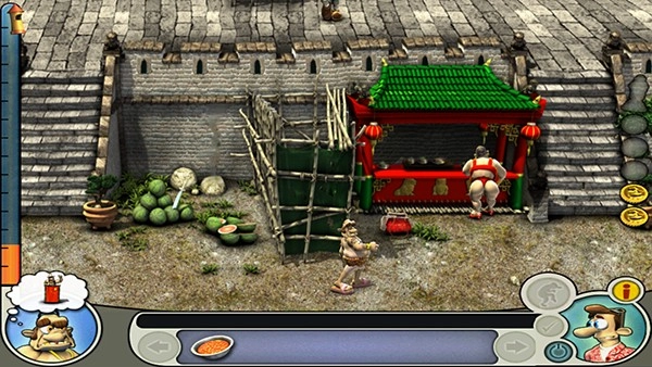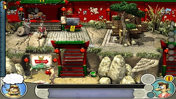 老人从右下角离开,来到冰淇淋机旁,这里的操作堪称“BULLSHIT”(真的太佩服想出这个点子的设计人员了,恶搞简直无敌……);接着来到左下角,在牛身上使用军刀;再到左上角,在地面上倒上汽油。等老人下去后,来到右中位置,在下水道盖上划燃火柴;随后到右上角,用鼓风机把炭火吹旺,拿石棉内裤包上一些炭火,接着把汽油倒入水盆里;回到中上位置,藏进篓子里,等老人脱鞋进去参拜时,把炭火放进他的拖鞋里,然后再躲回篓子里就大功告成啦。