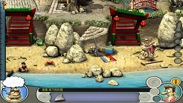 待老头吃完东西,拿内胎作用于放食物的篓子。待老头去打乒乓球时,把绳子用在冲天炮上,用锤子和钉子处理冲浪板,将石狮子头放在沙堆(小孩所在处)上并绕到右上方。等老头从右下方离开后,把鸭蛋用在乒乓球上。