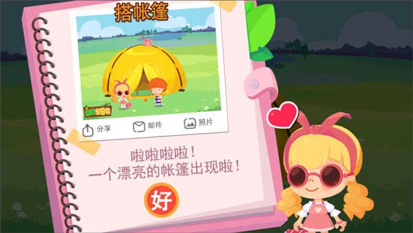 5、旗帜插好后帐篷就算是搭建好了,快来个糖糖一起拍照留念,分享给好友吧。