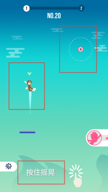 1、按住屏幕使角色晃动以调整方向,操控小猴子飞行,瞄准目标的圆形区域,让角色能够顺利抵达目标点。