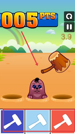 2游戏时,当不同颜色的地鼠从洞穴中冒头,玩家要找准时机,点击界面下方与地鼠颜色匹配的锤子图标,持续敲击直到地鼠缩回洞穴,以此累积分数。