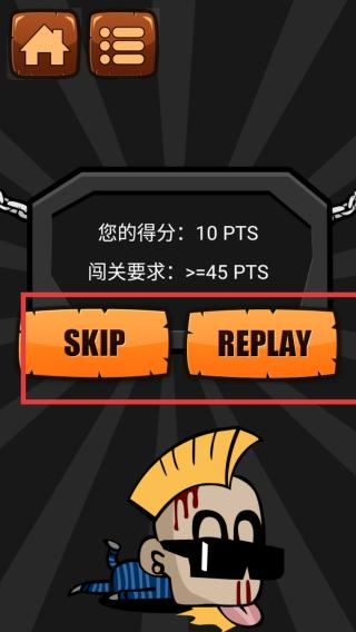3、当玩家未满足过关要求时,界面会显示SKIP跳过与REPLAY重玩两个按钮,玩家可自行选择跳过当前关卡或重新挑战该关卡。