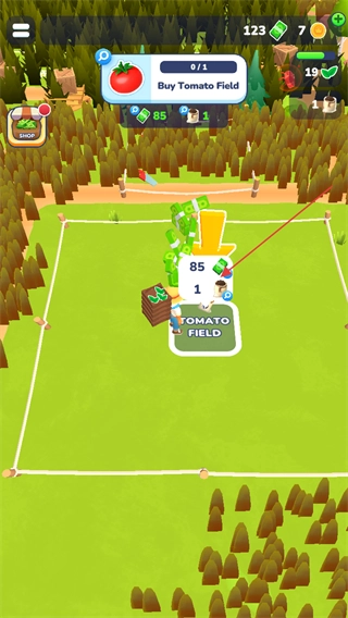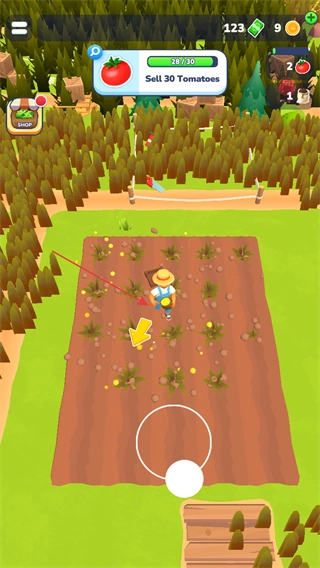 1、操控移动轮盘,引导角色移动至新的农田地皮区域,清理出目标地皮区域以完成解锁。