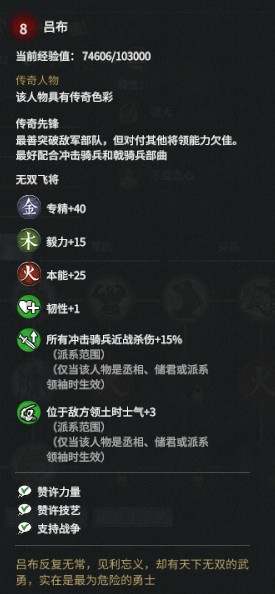 势力范围下全冲击骑兵护甲+15%(需担任君主、储君或丞相职位时生效)