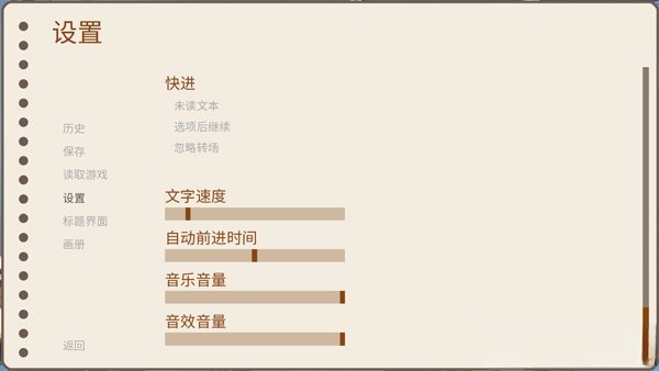 6玩家还能在设置界面里对文字显示速度、背景音乐以及各类音效等选项进行调整。