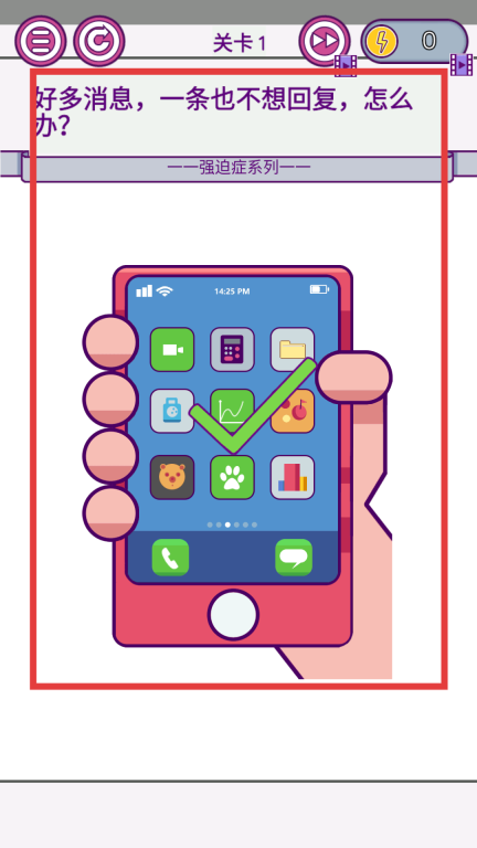 2进入关卡选择页面后,选择第一个关卡,系统会自动跳转至该关卡的游戏页面。在此页面中,按照指引找到并点击手机屏幕上的图标,即可完成该关卡的任务。