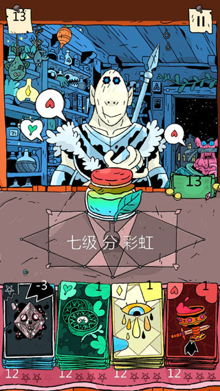 你将化身一位经营药水生意的店主,需要依据顾客的具体要求来调制对应的药水。界面底部会显示红、黄、蓝、绿四种不同颜色的卡片,每次调制药水时,都要从这些卡片里挑选四张放入中间的指定区域,卡片的摆放顺序和位置完全由你自由安排。