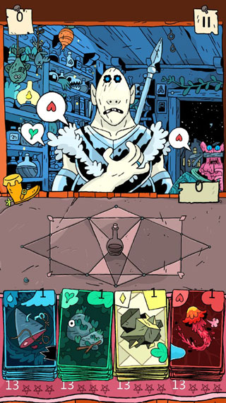 掌握药水制作方法后,玩家就能开启商店进行经营了。要注意,每位光临的顾客都有专属订单——他们头顶的文字泡泡会标明所需的药水原料。制作时必须至少用上一张顾客指定的配料卡,不然游戏就会结束。