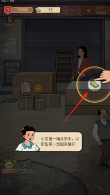 3、接待顾客(红箭头指示),完成交易流程(收取现金),成功赚取第一桶金(55元),解锁经营提速特权以实现收入翻倍,进而推动店铺持续发展。