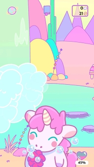 4、选择洗澡时,用洗澡球在独角兽身上轻轻拖动,洗完后心情完成度会达到45%。