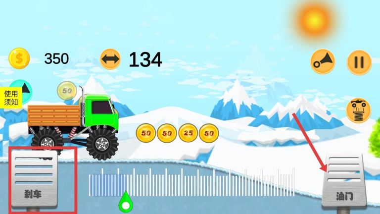 3、进入冰岛关卡后,屏幕下方会出现刹车和油门按钮,你可以通过点击油门按钮来控制卡车前进,点击刹车按钮则能让卡车减速或停下,以便在关卡中行驶。