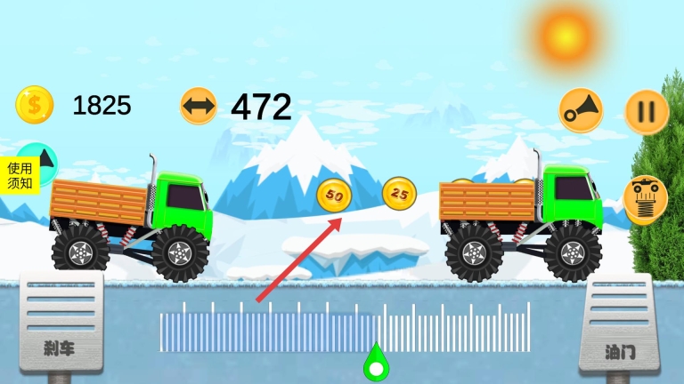 4、在冰岛关卡驾驶卡车时,要留意场景里的金币,通过控制油门和刹车,让卡车收集金币,同时保持平稳驾驶,完成关卡挑战,以获得更高分数。