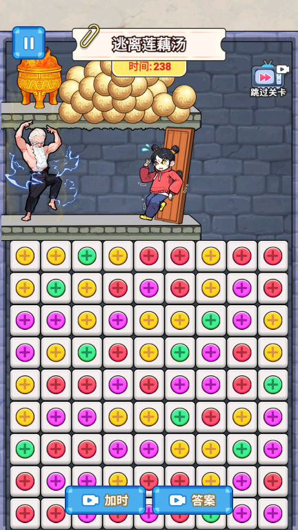 2、点击消除关键方块,让其他方块掉落,使金丹砸向坏人,帮助小女孩争取逃生的时间。