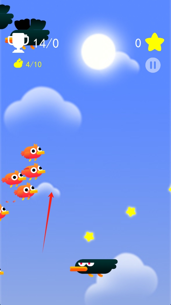 2、进入游戏场景后,操控橙色的小鸟群,在蓝天里灵活地飞行,精准收集黄色星星,同时躲避黑色小鸟。