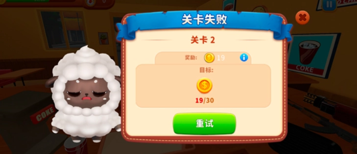 4、当时间结束没有达到要求,会显示关卡失败,点击重试。