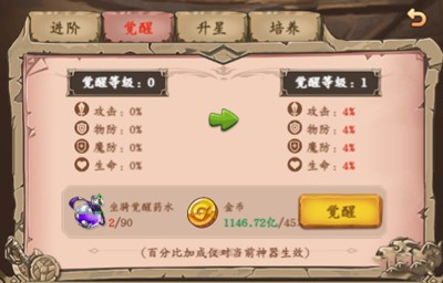 坐骑觉醒:百分比提高英雄的攻击、生命、物防、魔防