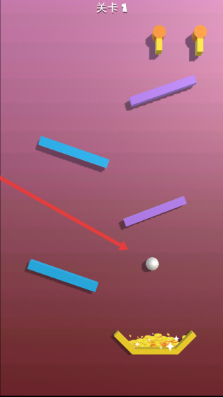 2、进入关卡1后,通过点击屏幕来控制小球,使其在彩色长条之间跳跃,同时避开障碍物,朝着金币容器的方向移动。