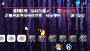 1当遇到燃烧的篝火这类障碍时,要在白块接触地面之前点击屏幕右侧,通过触发按钮1来越过该障碍。