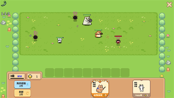 2、关卡中每次都会随机出现若干敌人,玩家需要把猫咪布置在恰当的位置,这样就能自动开启战斗。