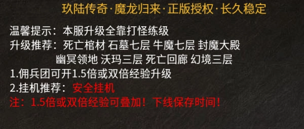 1、温馨提示:本服升级全靠打怪练级。