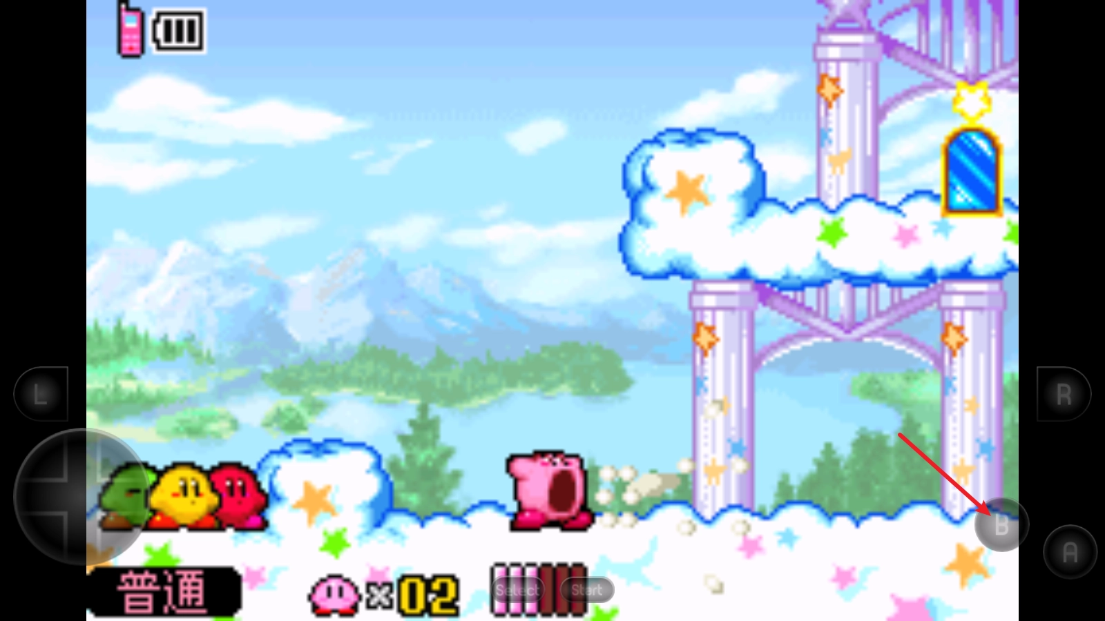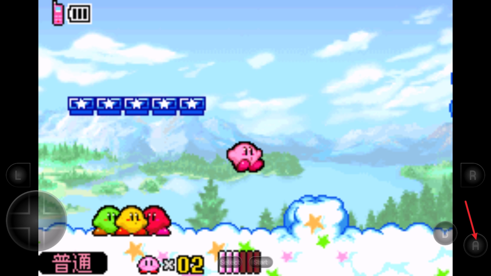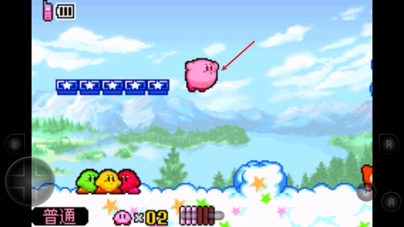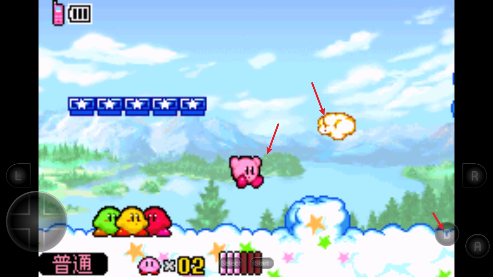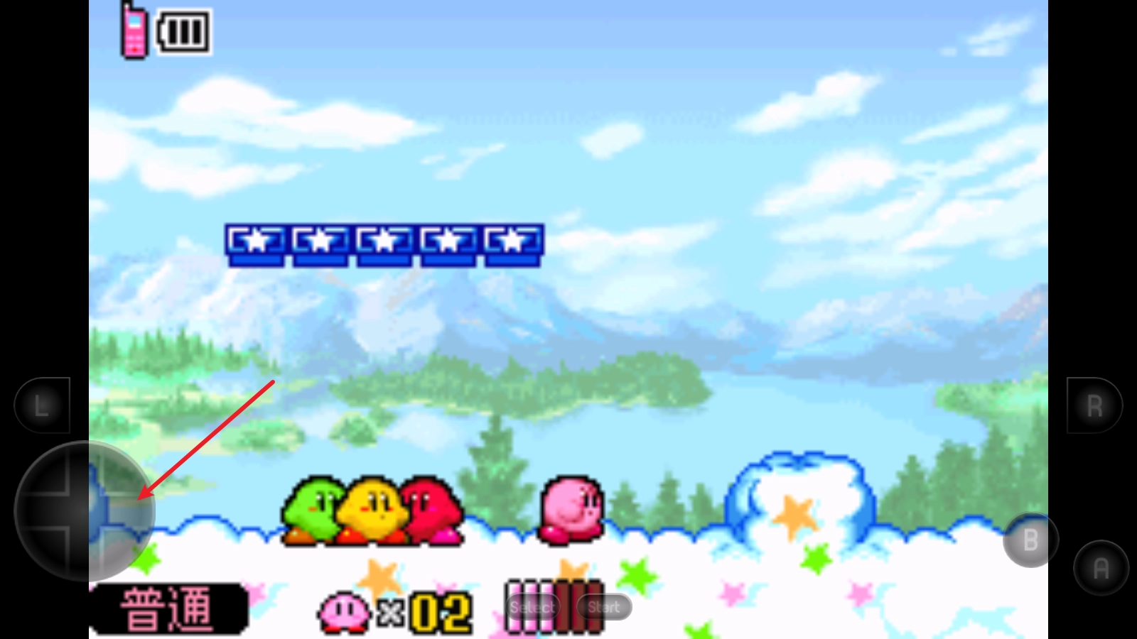 1、游戏中左侧的虚拟摇杆控制卡比进行移动。