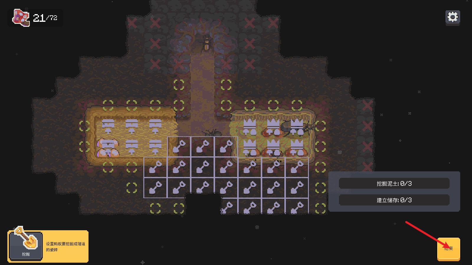 3、接下来我们进入蚂丘,在这里可以通过挖掘来解锁更多区域,选好位置后点击结束即可。