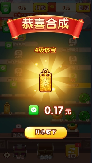 2、当三个相同的珍宝在一行凑齐时,就会自动合成出高一等级的珍宝,首次合成还能额外获得红包奖励。