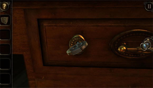 3、找到最右侧的抽屉,将从占卜机处获得的钥匙插入锁眼。打开抽屉后发现里面空无一物,接着查看抽屉左侧,能看到有个金属块嵌在滑道里,把它往里推到底。之后再看抽屉内部,会出现一个可旋转的把手,将其装到最左侧的抽屉上,转动几次就能打开抽屉了。