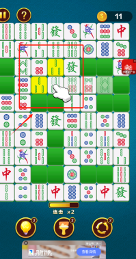 3、点击红框选中的麻将牌来消除,借助道具获取更多分数,留意连击倍数的加成效果。