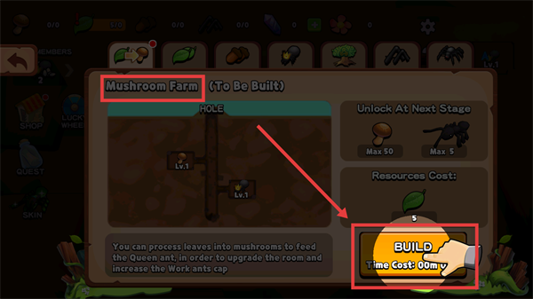 1、进入游戏后,点击BUILD选项建造蘑菇农场(MushroomFarm),以此为蚁后提供食物。