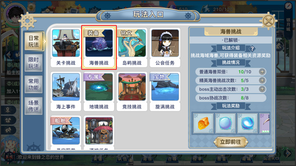当游戏中的主角等级提升至7级,或是在海军训练营成功通关1-2-15关卡后,海兽挑战玩法便会解锁。此时,只需点击主界面右下角的“玩法入口”图标,就能从该界面快速进入海兽挑战系统。
