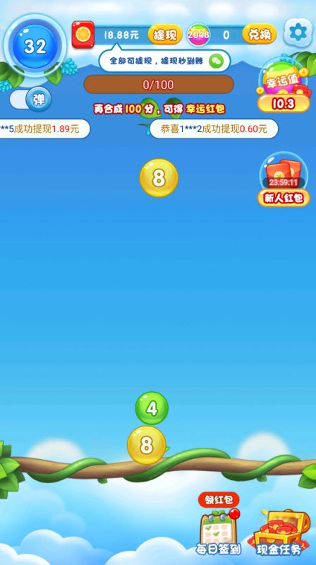 3、每次成功合并两个小球,就会生成一个数值翻倍的新小球,玩家需要持续重复这样的操作,直到达成合成2048的目标。