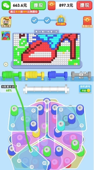 玩个毛线,三消玩法的闯关小游戏。玩家要想让关卡中不同颜色的毛线成功消除掉,那么需要快速凑齐三个一样颜色的毛线,并且与上面的盒子颜色一样,自然可以实现消除,甚至后面还能直接开启自动消除功能,就能轻松过关领福利,每次抽出一些时间去闯关就成。