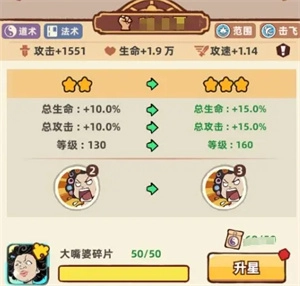 3、升星:获取到重复的伙伴会转化成碎片,花费特定碎片和对应职业的徽章可以增加星级,提升星级后会突破等级上限同时增加属性,伙伴可以升级至更高的等级,并且会提升主动技能的等级。