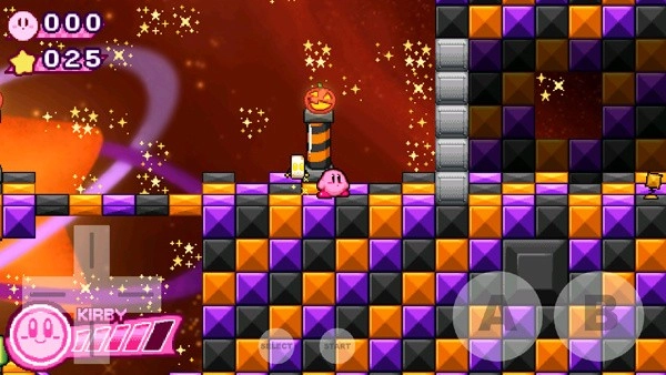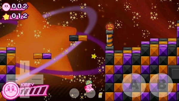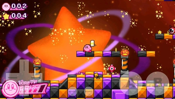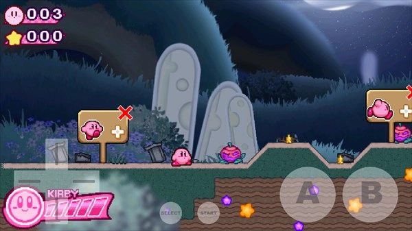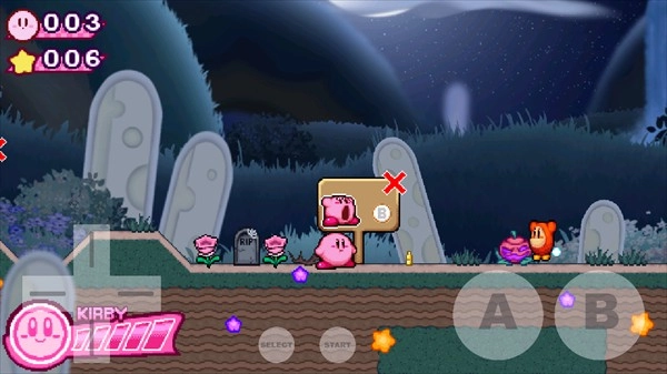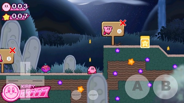 2、B键吸取面前的方块或是敌人,吸取后按A键可吐出方块进行攻击,吸取敌人后按十字键下键可以获取敌人能力;