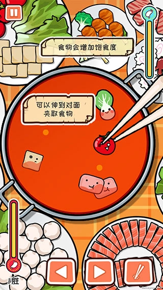 在游戏里,食物能提升饱食度,等饱食度达到上限就能赢得对局,而且还能伸到对面去夹取食物。