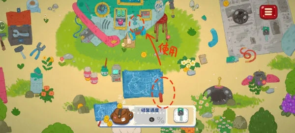 1、螺丝刀在蓝色图纸上面,捡到后要去飞船使用,需要多点几下修理!