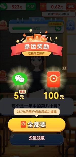 游戏里的题目数量特别多,玩家能尽情答题,只要努力答对足够多的题目,就能不断获取奖励。