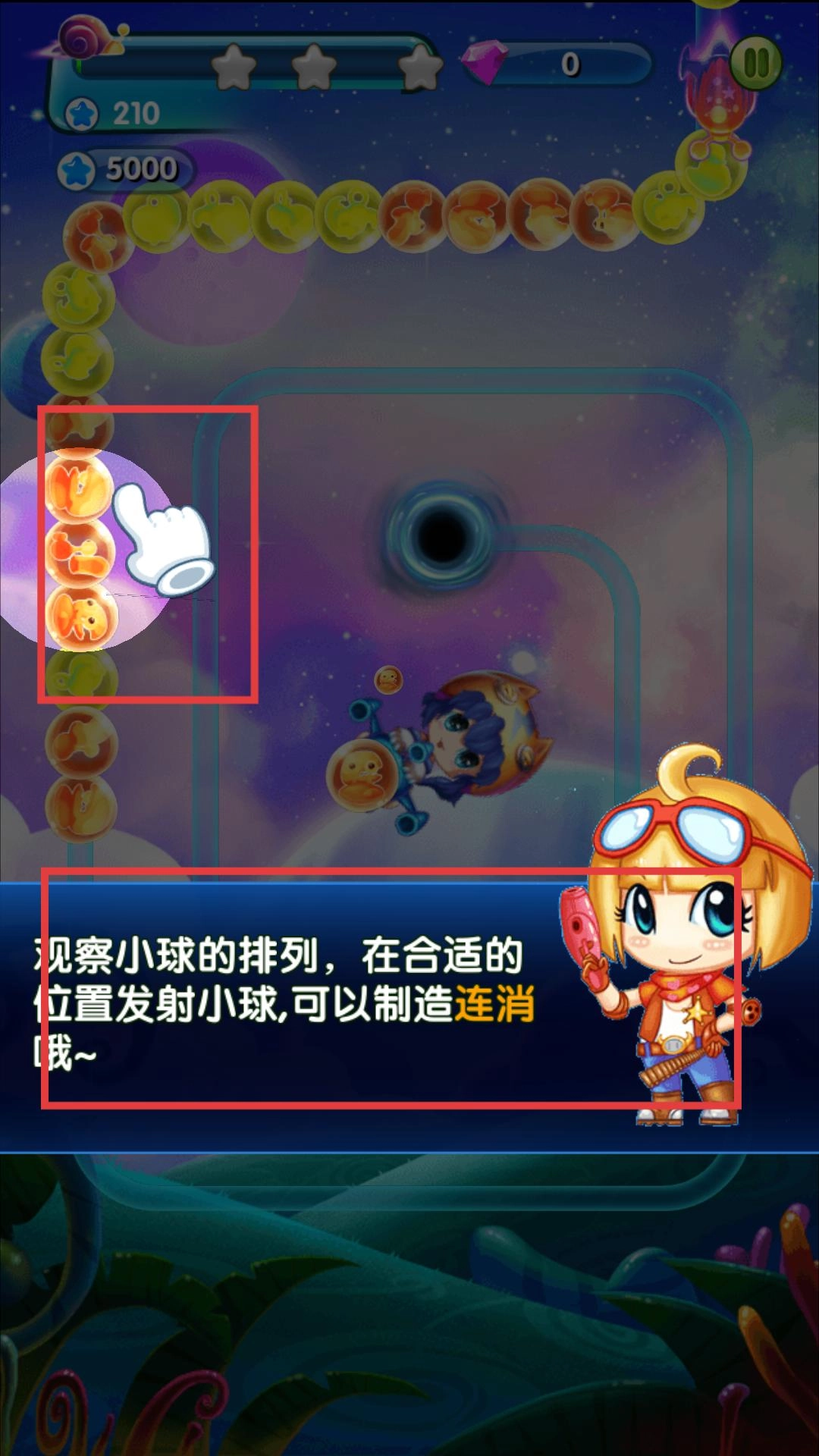 认真观察小球的排列状态,在恰当的位置发射小球,努力创造连消效果,连消可以获取更多积分。