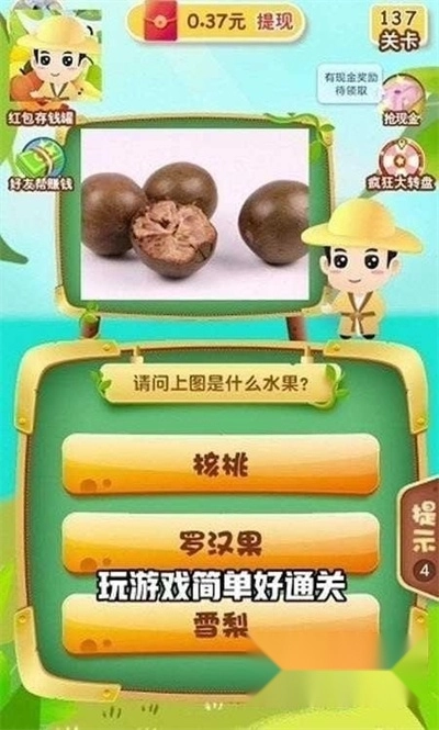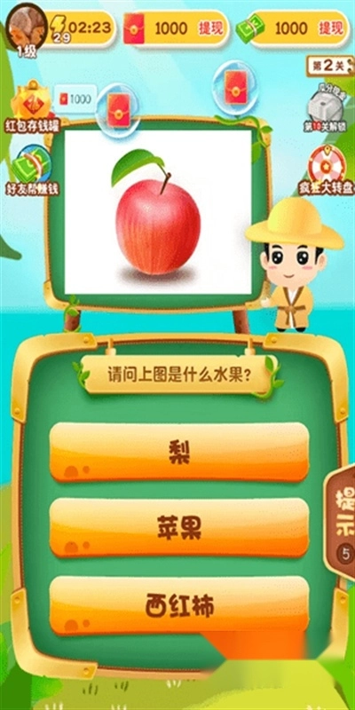 《天天猜水果2024红包版》是一款结合水果猜谜与红包奖励的全新益智游戏。玩家需依据题目给出的图片,猜出对应的水果种类。游戏中出现的水果均为日常生活里的常见品种,像苹果、猕猴桃、香蕉等都包含在内。玩家能够轻松猜对答案,进而获取红包奖励。如果你对此感兴趣,不妨来体验一番!