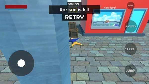 进入关卡后,屏幕左侧的按键用于控制移动,右侧则对应攻击、跳跃等操作;只要成功操控卡尔森抵达商店,就能开启下一关。