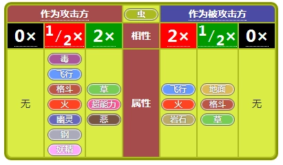 虫系克草、超能力、恶,弱点飞行、火、岩石,抵抗地面、格斗、草