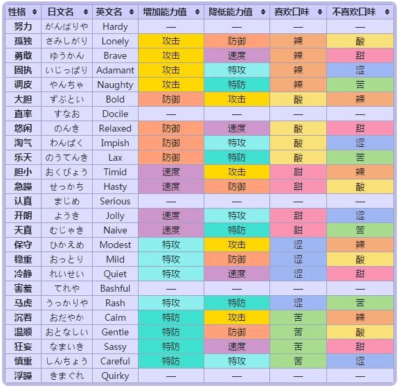 的经验值和个体值没有影响)。性格还会决定宝可梦偏好与厌恶的口味,那5种不影响能力值的性格也同样不影响口味。从心金魂银版本起,受性格影响而增减的能力值会用红色或蓝色进行标注。精灵
