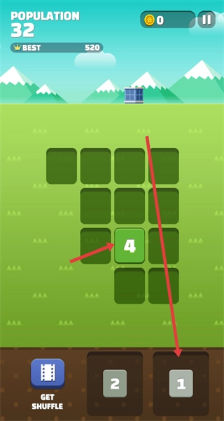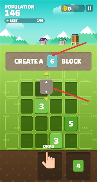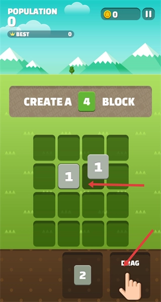 游戏开始时,拖动底部的数字块到网格中,相同数字相邻会自动合并,通过逐步合成更大的数字来提升Population,同时拓展网格建筑积累分数,冲击最佳纪录。