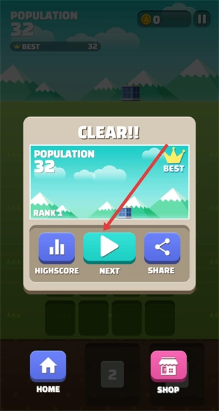 胜利通关后,结算页面会显示Population和Best数据;点击NEXT按钮可进入下一关继续挑战,通过突破纪录还能解锁更复杂的合并玩法。