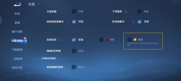 4、在该功能界面下滑,在最下面的位置有【在线状态】设置,将在线状态改成【隐身】即可,这样你的游戏账号就处于隐身状态了。