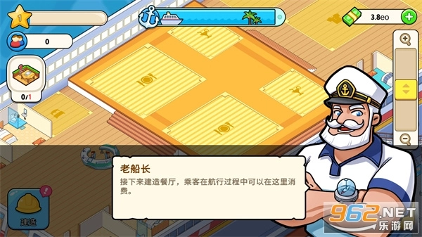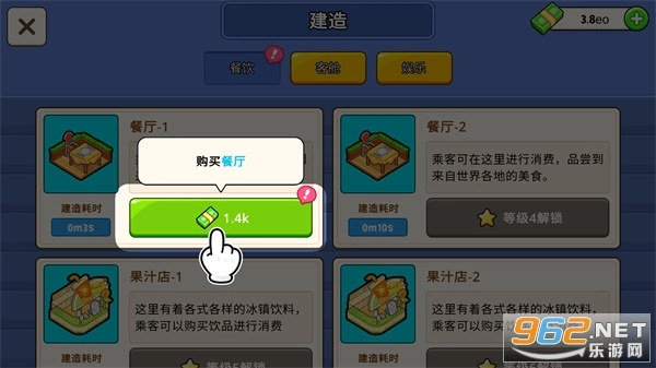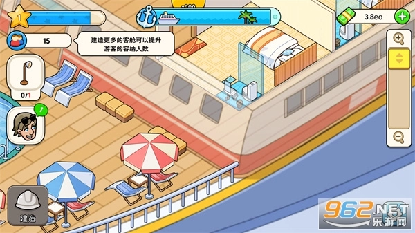 当你拥有足量的货币后,点击“建造”按钮,就能修建餐饮区、客舱以及各类娱乐设施了。不过要留意,部分设施的建造需要满足对应的等级条件才能进行。