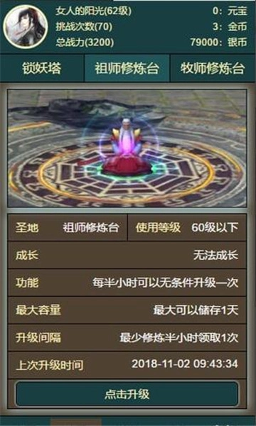 在60级之前,[祖师修炼台]支持每半小时无理由提升一级等级。