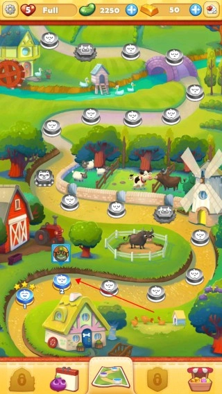 全球化的农场 地图上设有若干标签。比如,标注着奶牛的关卡,玩家通关后就能得到动物奖励;而标有脆脸(小浣熊)的关卡,玩家得赶在浣熊之前把水果和蔬菜都消灭掉。在场地的远处,北极熊、猫鼬、斑马、大象和狮子都在那儿。